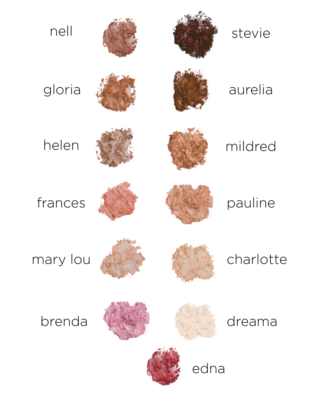 May Contain (+/-): Titanium Dioxide (CI 77891), Iron Oxides (CI 77491, CI 77492, CI 77499), Carmine (CI 75470), Ultramarines (CI 77007), Chromium Oxide Greens (CI 77288), Chromium Hydroxide Green (CI77289), Manganese Violet (CI 77742), Ferric Ferrocyanide (CI 77510), Yellow 5 Lake (CI 19140), Blue 1 Lake (CI 42090), Red 40 Lake (CI 16035), Tin Oxide